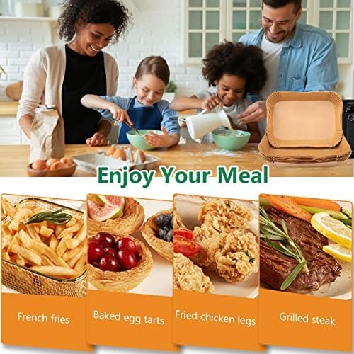 ✅【Food Grade Material】Our rectangle air fryer disposable paper liners are made of food-grade unbleached parchment paper with double-sided silicone oil coating, no fluorescent, BPA-free to strict quality standards. High temperature resistance up to 428 degrees Fahrenheit, maintaining integrity and aesthetic appearance of bread, dumplings, snacks. Oil proof parchment paper liners are no affection to the taste of food and the hot air circulation of air frying.