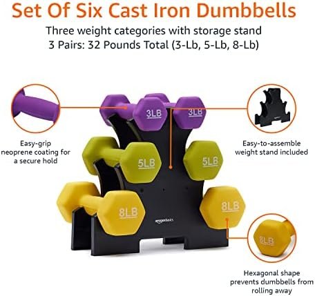 Amazon Basics 32 Pounds Neoprene Workout Dumbbell Weights with Weight Rack – 3 Pairs of Dumbbells