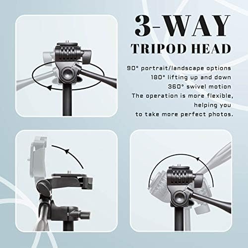 - 3-WAY PAN TRIPOD HEAD & QUICK-RELEASE PLATE & BUBBLE LEVEL – Multifunctional tripod head can realize 90 Degree portrait or landscape options, 180 Degree lifting up and down tilted and 360 Degree horizontal swivel motion, helps you adjust easily to find the perfect shooting angle. With quick-release plate, release and install devices become much more efficient and easier. Built-in bubble level helps you indicate whether a surface is horizontal (level) or not.