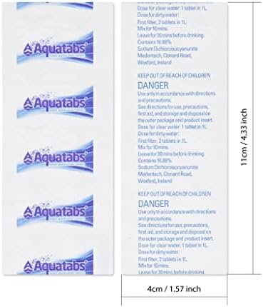 DRINKING WATER, ANYTIME, ANYWHERE – Aquatabs are the world’s most popular tablet and the ultimate choice for portable water treatment tablets. Removes 99.9999% of Bacteria, 99.99% of Viruses, and 99.9% of Cysts (Giardia). French/English packaging and instructions of use.