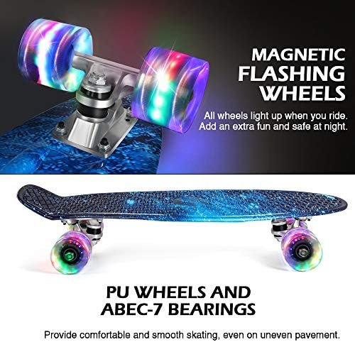 Create Fun: The skateboard is equipped with light up wheels for some seriously cool cruising, the lights on the wheel when it rolls is bright and colorful, add an extra element of fun. You don’t have to worry about charging it or replacing batteries either, which always light up as you ride.