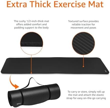 Amazon Basics Extra Thick Exercise Yoga Gym Floor Mat with Carrying Strap – 74 x 24 x .5 Inches, Black