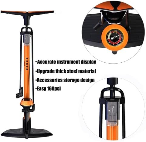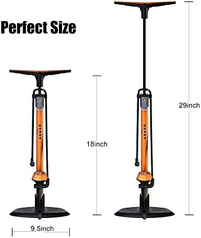Ergonomic design-Egromically designed comfortable handle,Floor pump with easy to read gauge,Max 174 PSI / 12 Bar high pressure capacity, accurate air pressure can be displayed when inflated, making it easier to visually see and fit easily into the proper pressure prevents accidental tire blowouts