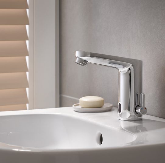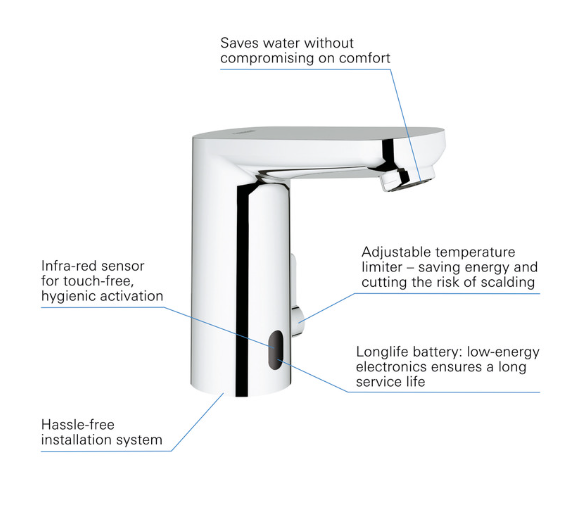 The Grohe Get E infrared electronic bSTOK CODE mixer features a mixing device and adjustable temperature limiter, and an infrared sensor for bi-directional communication for monitoring, configuration and servicing. The sensor controlled Grohe Get bSTOK CODE mixer tap provides a hygienic, hands free system for a great addition to any modern bathroom. The Grohe Get sensor bSTOK CODE tap is WRAS approved, with a durable chrome finish that complements the brass construction.