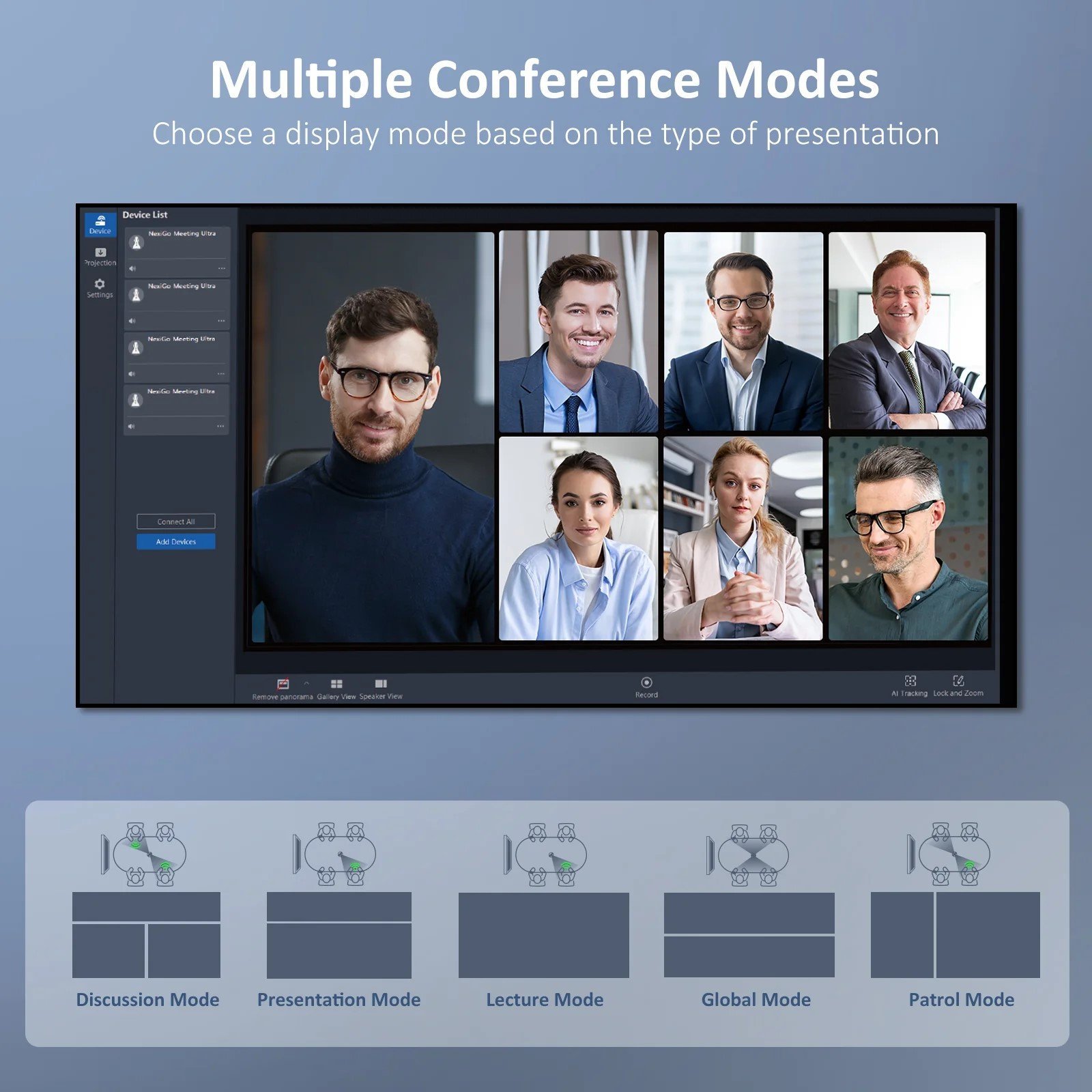 Solution of Multi-Camera : Can integrate up to four video conferencing cameras at once, enabling image and audio capture throughout a wider area. Additionally, provide NexiGo Meeting Studio app instantly grasps the status of all participants in the meeting room. Multiple conference modes can be switched freely to get the best view of the conference. Perfect for long-table meeting rooms, U-shaped meeting rooms, and lecture halls.