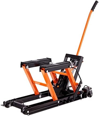 High-quality Steel Material: Made of high-strength solid steel structure and coated with a bright powder coating, this motorcycle jack is rust, corrosion, and grease-resistant, ensuring a long-term use. Neatly store it in your garage or repair shop for easy access. Get your hydraulic motorcycle jack today and make motorcycle maintenance a breeze!