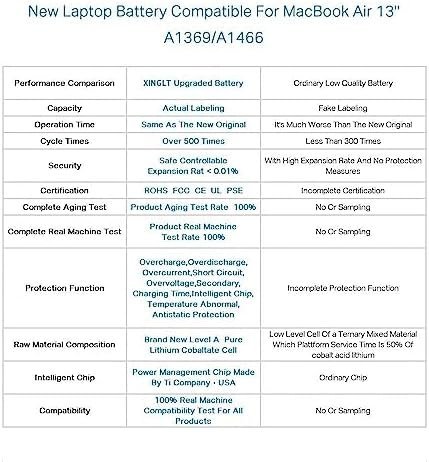 - Newest Premium Grade Cells: XINGLT MacBook Air laptop replacement battery ensure fast charges and low power consumption; Built-in circuit protection ensures both safety and stability. UL-/CE-/FCC-/RoHS-Certified for safety, About 500 recharge cycles over the life of the battery,(Life cycle: 3-5 years)