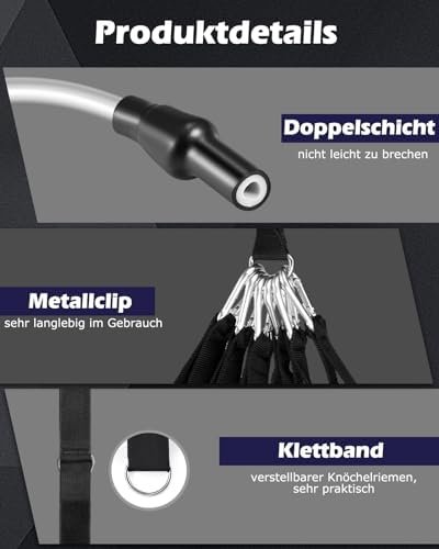 [Complete Workout Kit] – Our fitness bands set includes 💪 6 durable tube resistance bands, 2 ankle straps, 2 handles, 1 door anchor, 1 storage bag, and a training guide poster. The widened handles provide a better grip, and the stainless steel carabiner clips on the workout bands ensure enhanced durability.